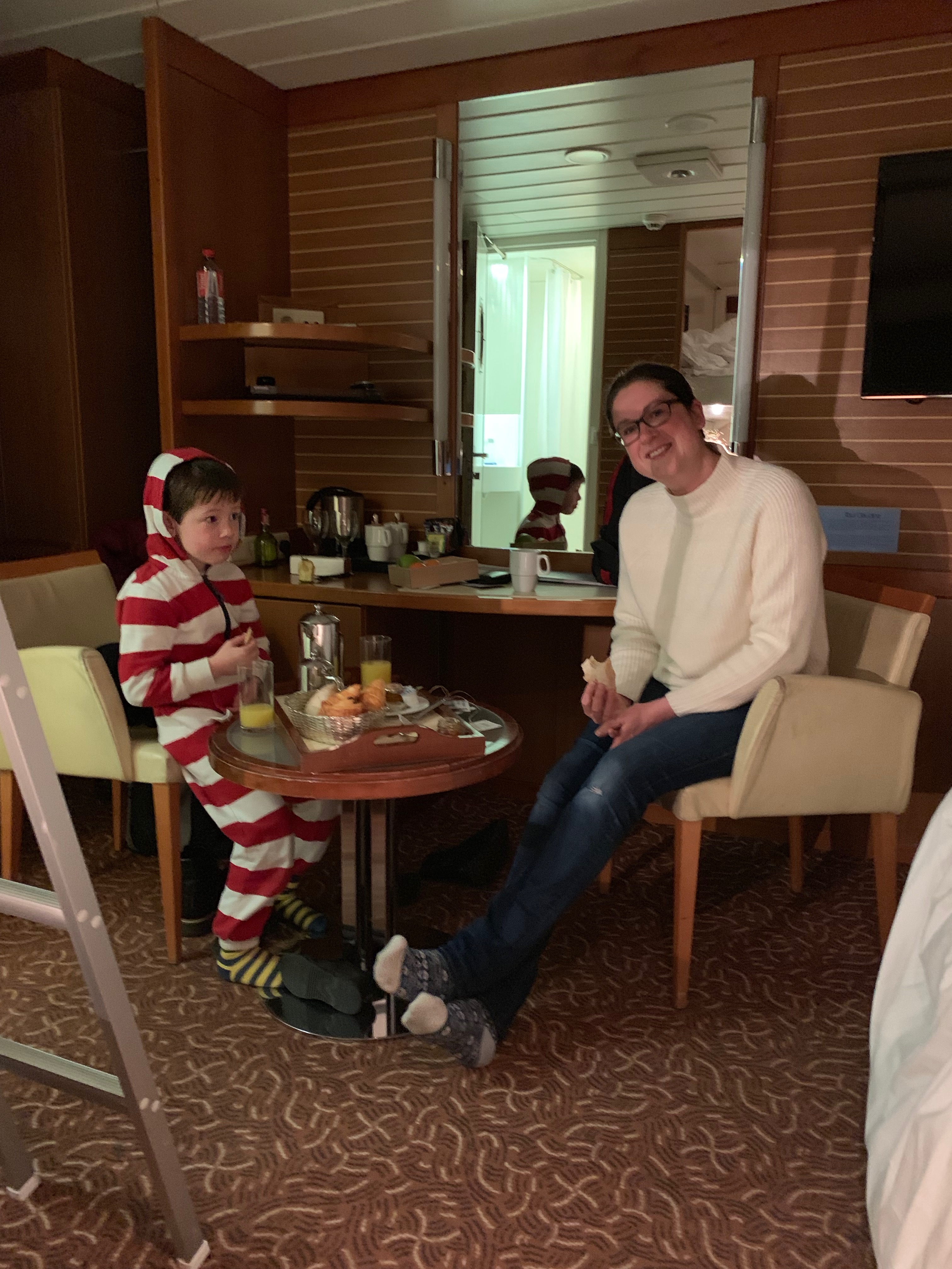 I do like Brittany Ferries: Nice linen and pillows in their cabins and decent breakfasts. Hugh thinks of pain au chocolat as a kind of birthright since he was born, in Versailles no less, on French soil. He is looking forward to seeing lots of French flags and rubbing his Italian-born younger brother’s nose in it.