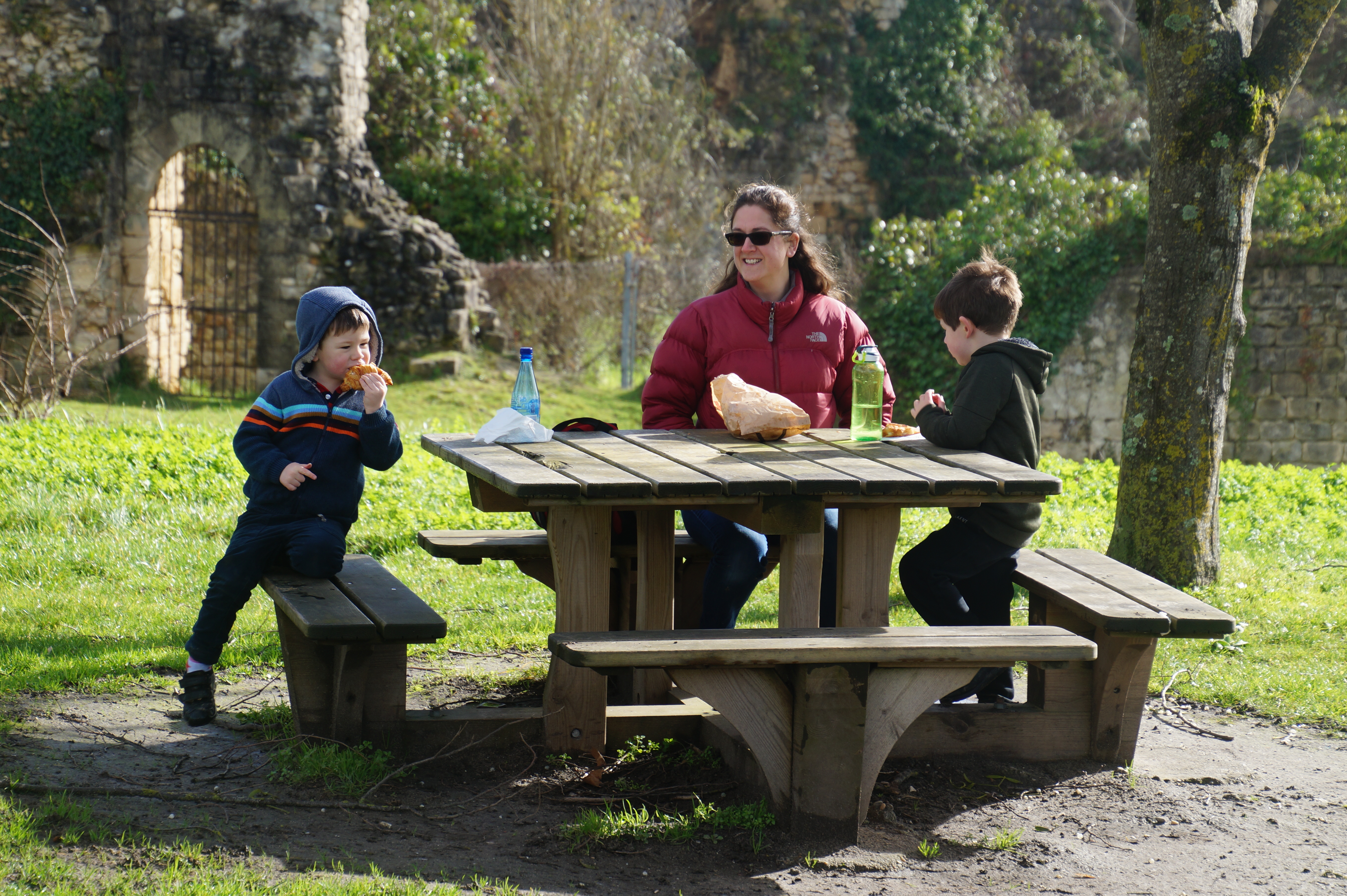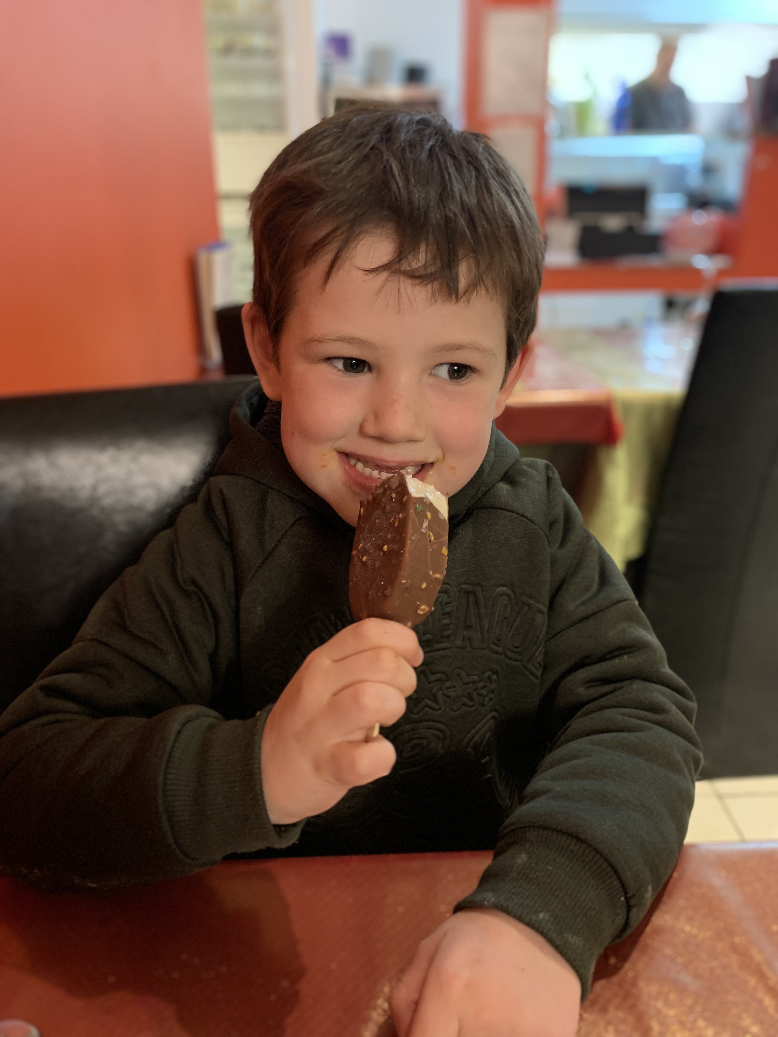 Luckily, Trencherman James always has to eat. So me and him go and find pizza and Tissy wakes up Hugh so they can come and join us. The boys have pizza and M&M ice lollies, and everything is back on track for now.