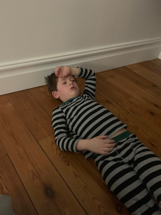 The boys are tired and sleep in. Hugh wakes up so hungry he lies on the floor claiming he is feeling dizzy. James snoozes on while Tissy takes our porridge monster down to breakfast.