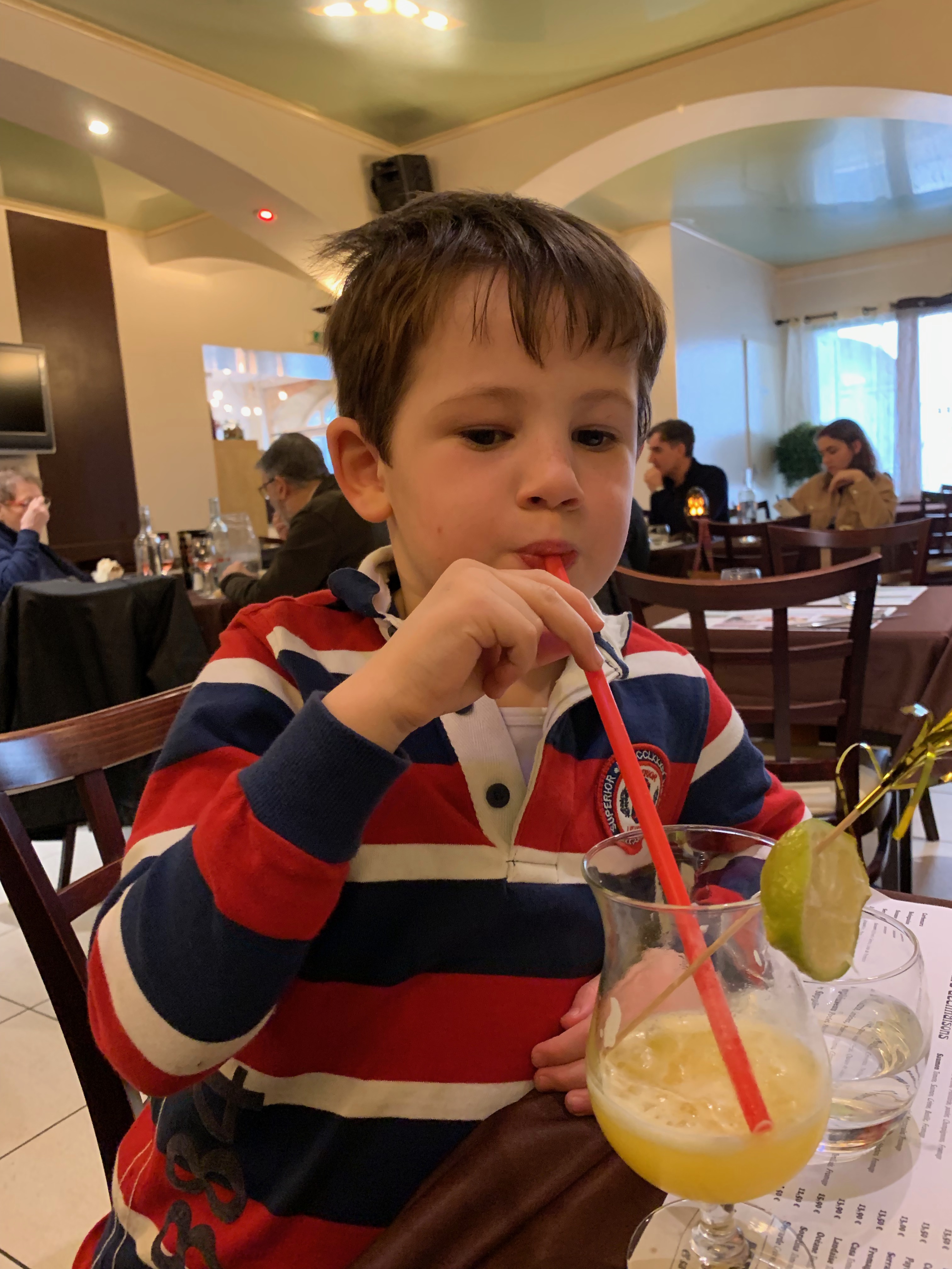 And so to lunch. Just after midday we slip into a little restaurant that looks dead but is actually brimming with office workers. We are lucky to get the last table at barely 1230. Hugh spots a boy at a neighbouring table drinking a lurid green fruit cocktail and immediately goes into a decline, having been told he can’t have juice.