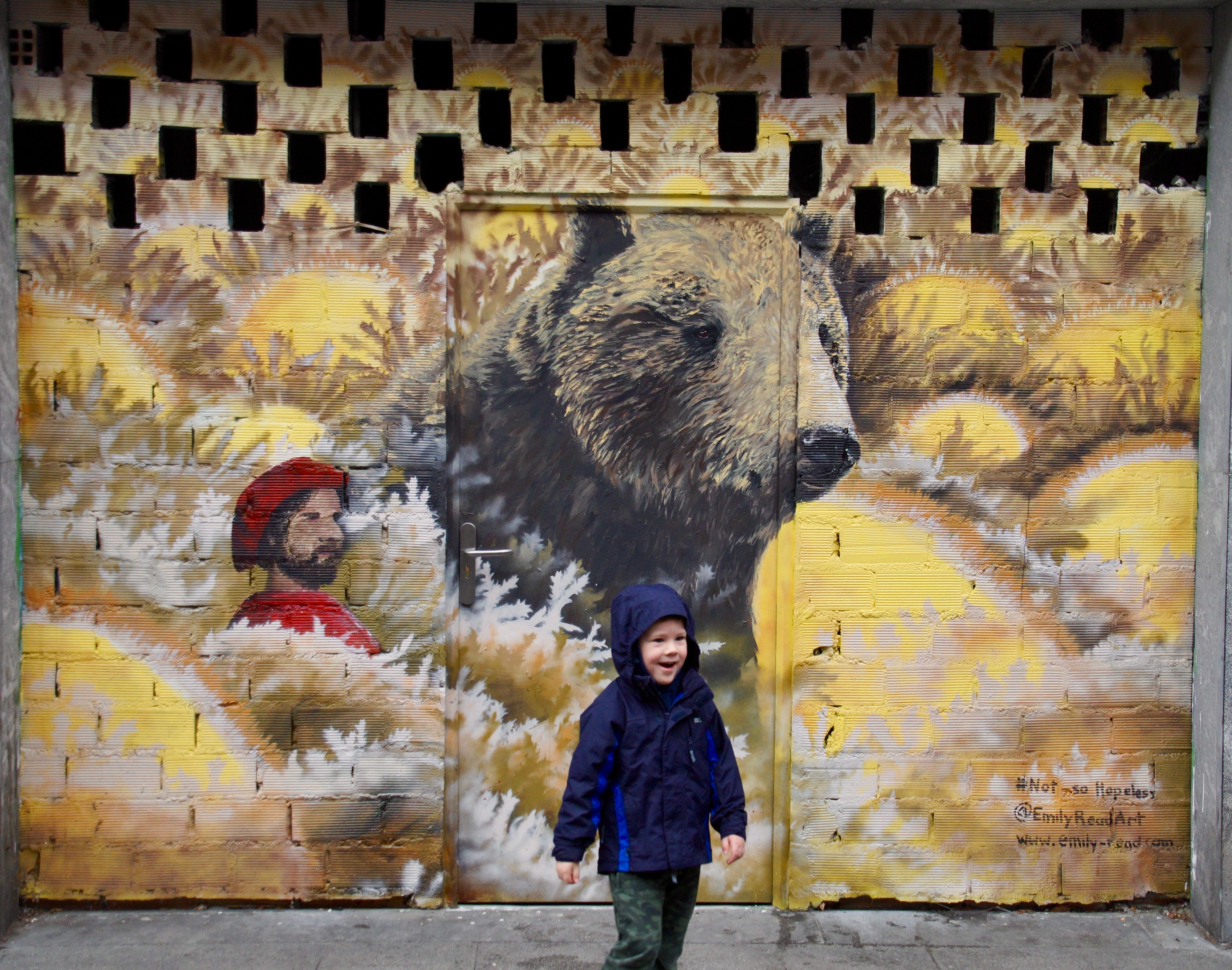 At the tourist office, they highlight a sculpture-themed walking tour, and James, who likes to act the baby bear, is much taken by a mural on a nearby square.