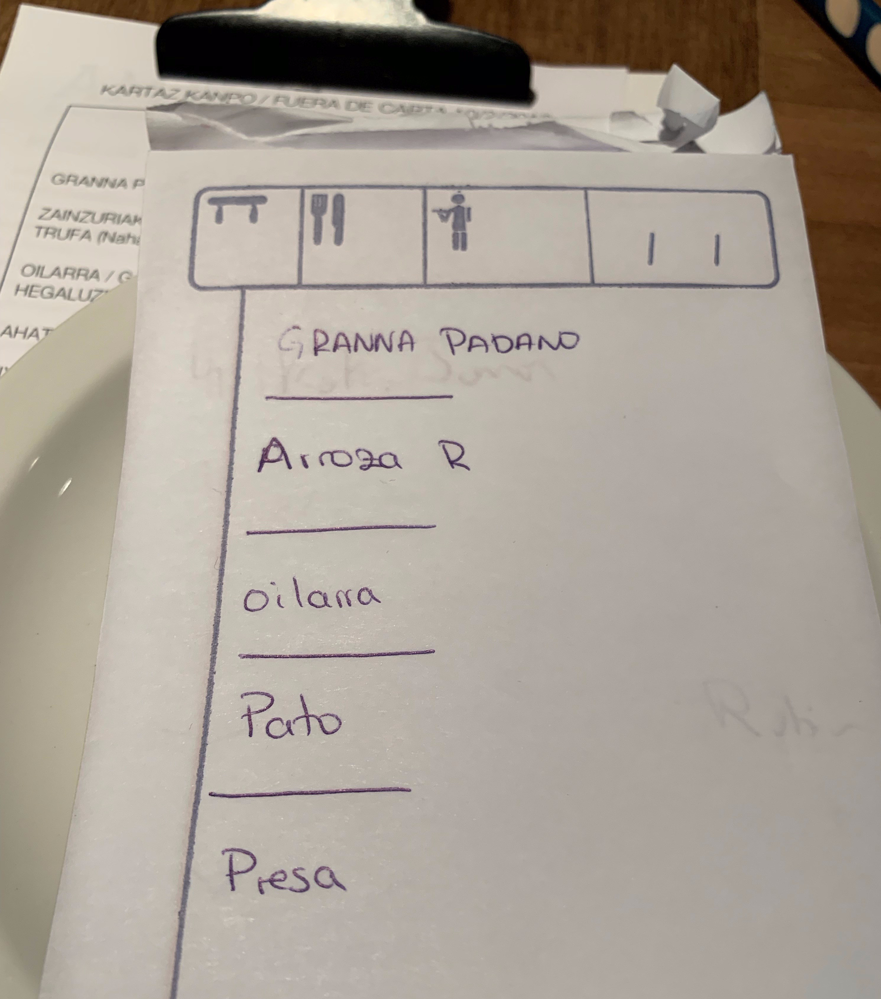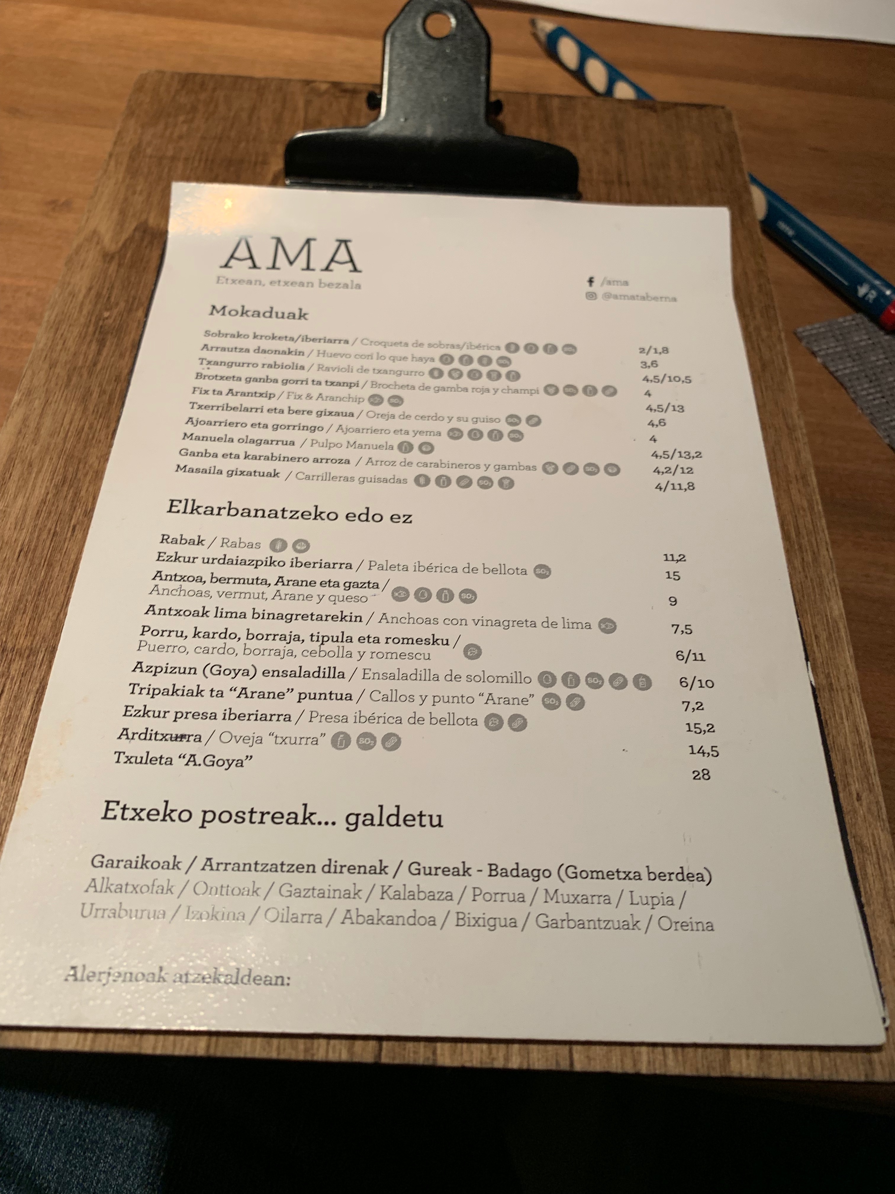 The duck must have been a Sunday special. The full menu for Basque/Spanish speakers:
