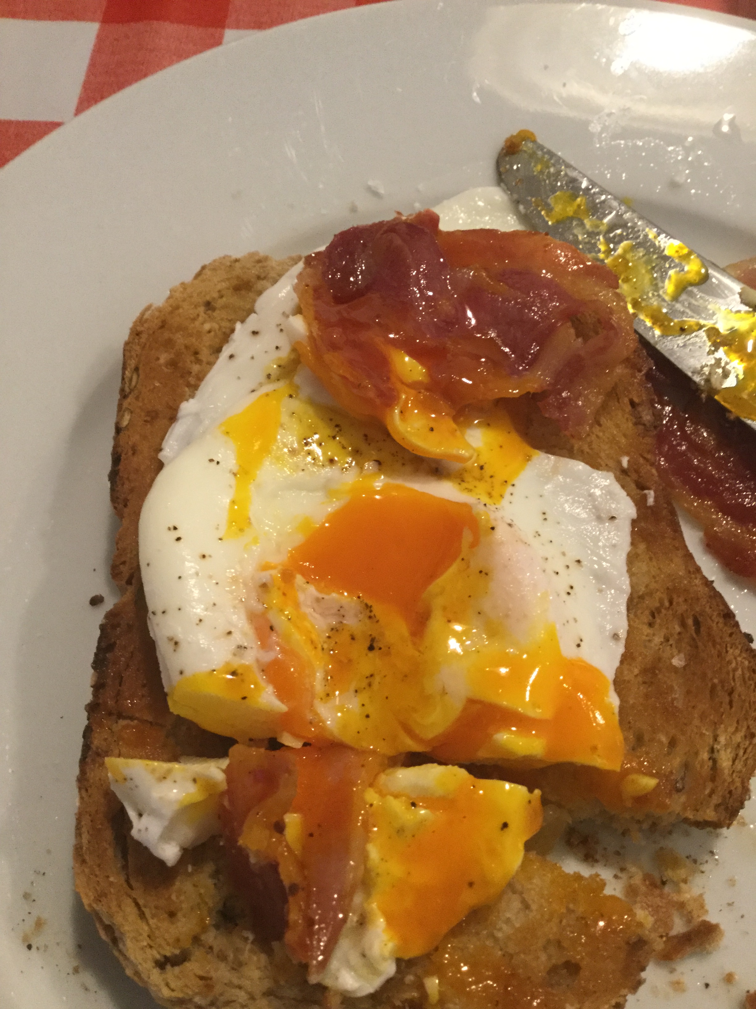 I like bacon enough to stocks up on Ayrshire middle made by Ramsays of Carluke when I am back in Scotland. But pancetta, Italian cured pork belly, is a pretty good substitute as the salty sidekick of poached eggs. It is the quality of the eggs, and the precision of their cooking, that counts more in this timeless combination. In Italy, I miss French bread more than bacon, or anything else from perfidious Albion.
